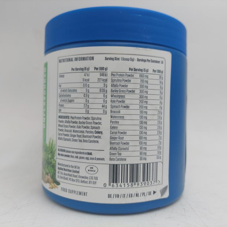 ترکیبات: پودر پروتئین نخود، پودر اسپیرولینا، پودر یونجه، پودر علف جو، پودر علف گندم، پودر کلم، پودر اسفناج، کلم بروکلی، شاهی، جعفری، کرفس، پودر هویج، ریشه زنجبیل، پودر چغندر، یونجه (جوانه)، چای سبز، بتا کاروتن.
